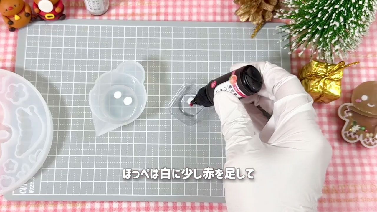 モールドの目と口のくぼみに白の着色レジンを、ほっぺのくぼみに薄ピンクの着色レジンを少しずつ入れます。