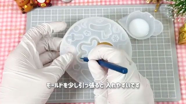 体の外側のくぼみに白の着色レジンを少しずつ入れます。モールドを少し広げながら行うと入れやすいです。