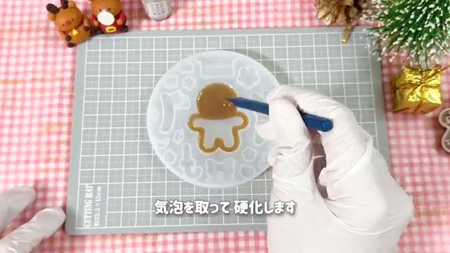 モールドの顔部分のくぼみまでクッキーカラーの着色レジンを流し入れます。