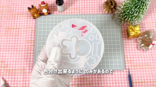 クッキーパーツの中にクリスマスカラーのビーズやホログラムを封入します。先程作ったヒイラギやキャンディも入れました。