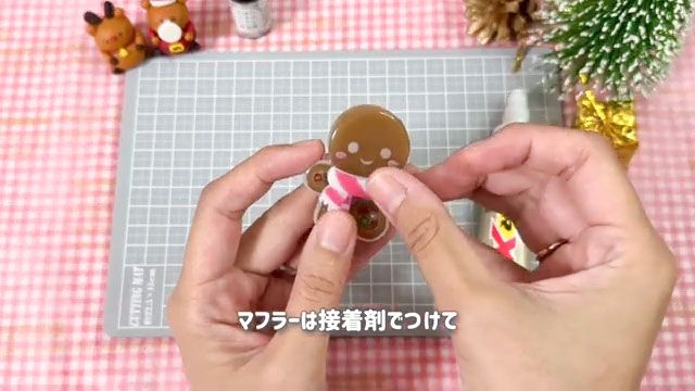 マフラーやキャンディ、ヒイラギなどの小物パーツを加えれば、よりクリスマスらしい華やかさがプラスされます。シェイカー内部にはクリスマスカラーのビーズやホログラムを封入すると、光にきらめく楽しい雰囲気に。フィルム貼りやコーティングも丁寧に行うことで、ぷっくりとつややかな仕上がりになります。