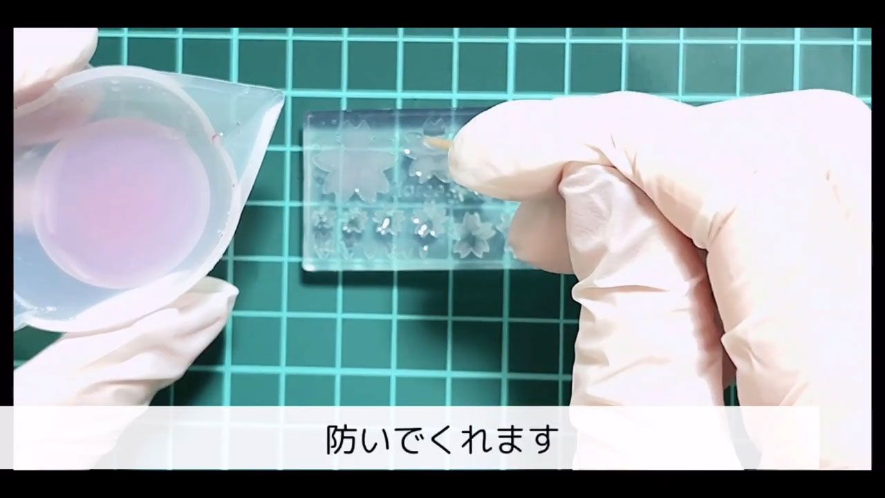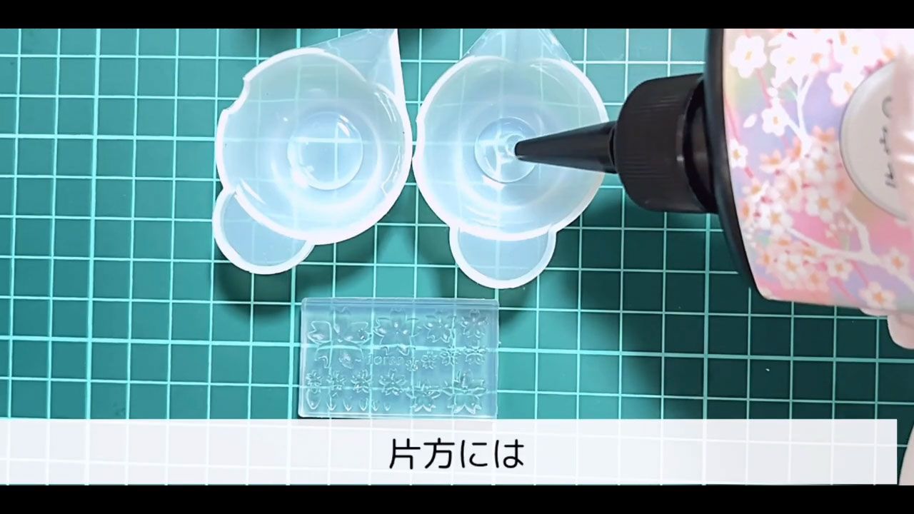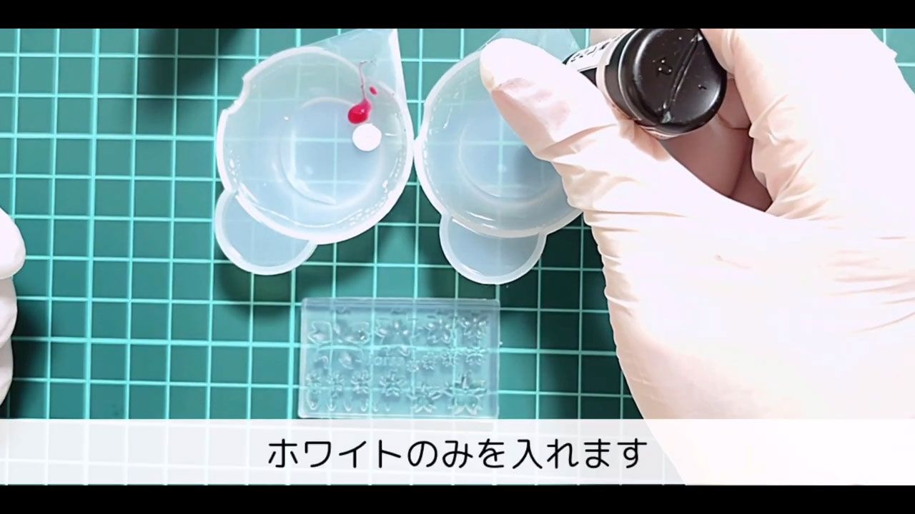 桜モールドの花びら部分に、白の着色レジンを入れます。爪楊枝やワイヤーなど、先の細いものを使うと綺麗に仕上がります。