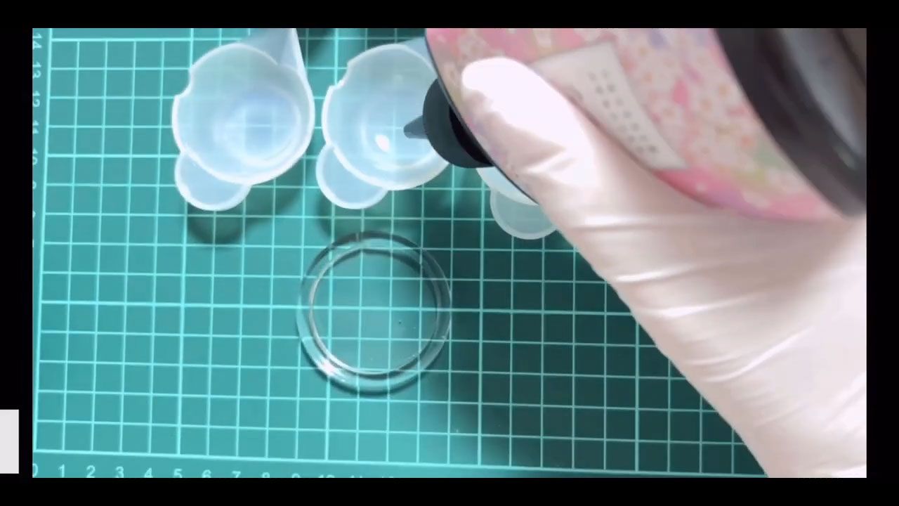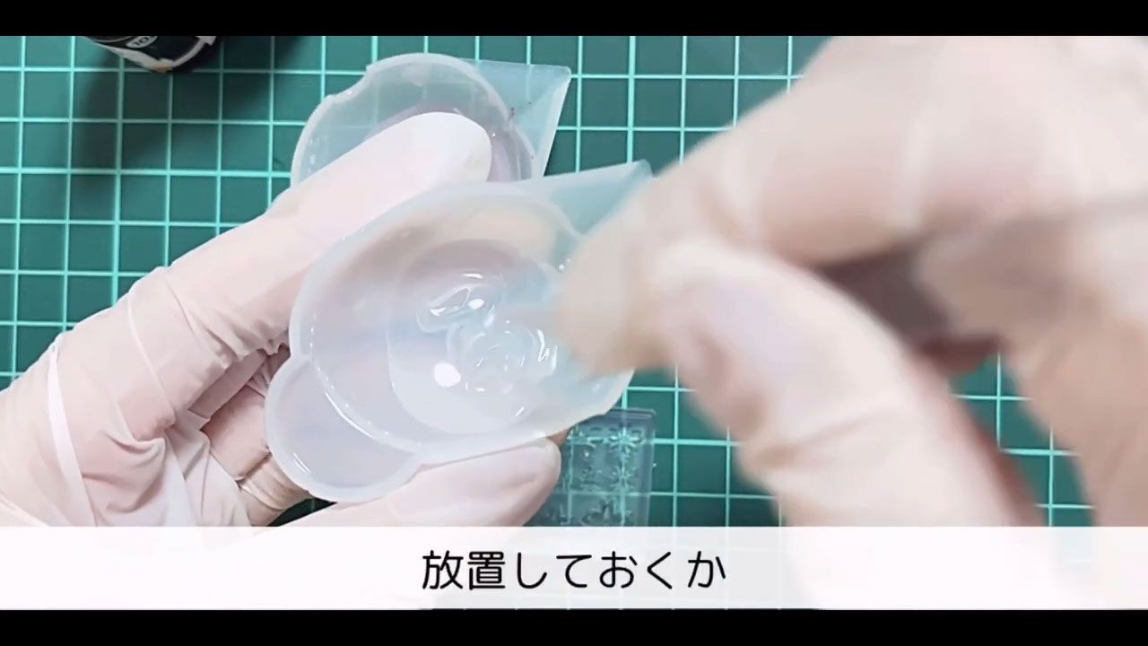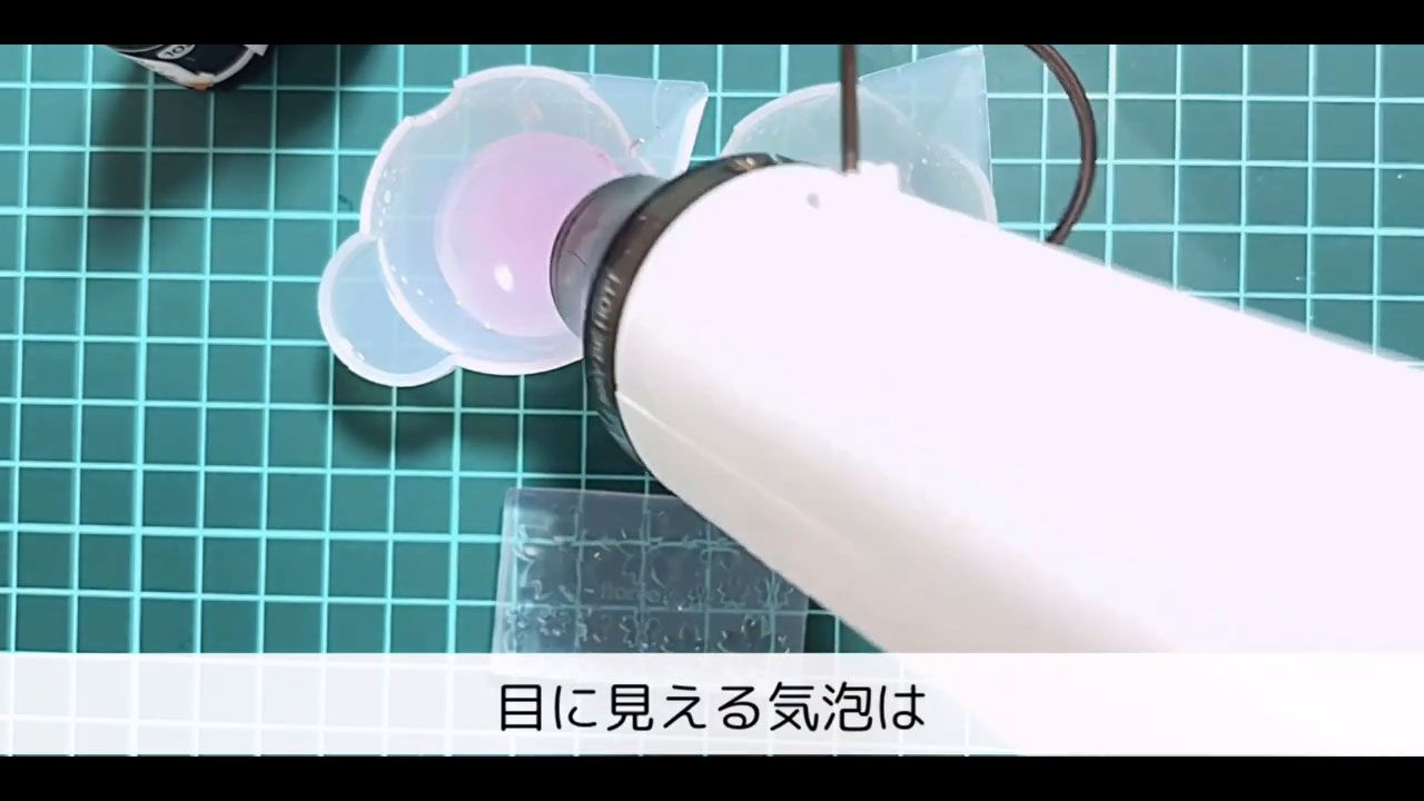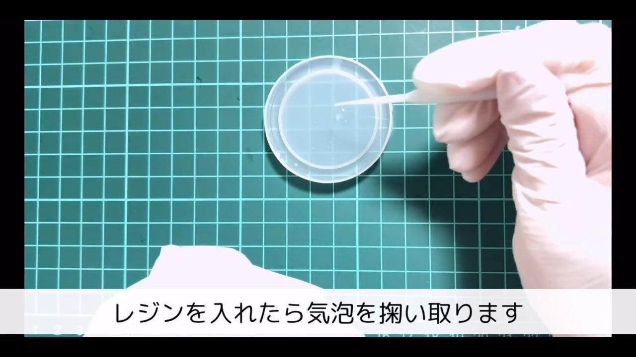 丸いシェイカーモールドにクリアレジンを流し入れ、気泡を取り除いて3分硬化します。