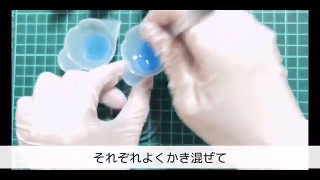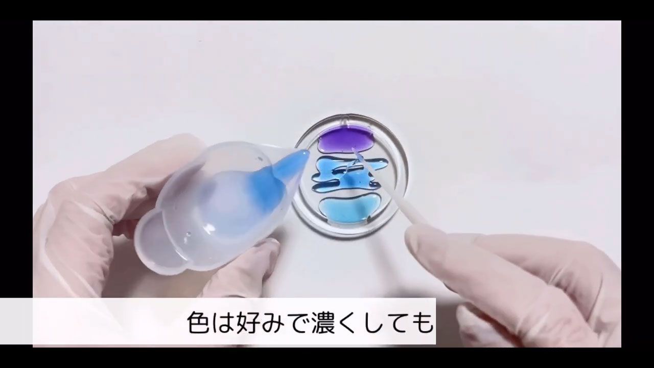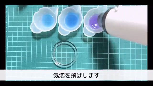 水色の着色レジンを下側、紫の着色レジンを上側、青の着色レジンを真ん中に流します。