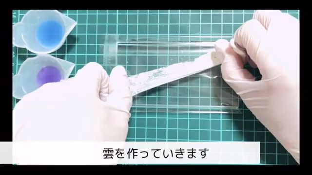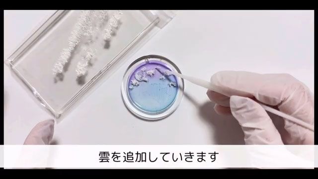 クリアレジンを流して薄く塗り広げ、作った練り消し雲をお好みの場所に乗せます。