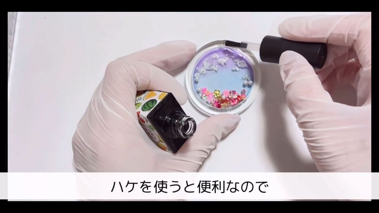 お好きな封入材を入れて、フレームにコーティング剤を塗ります。