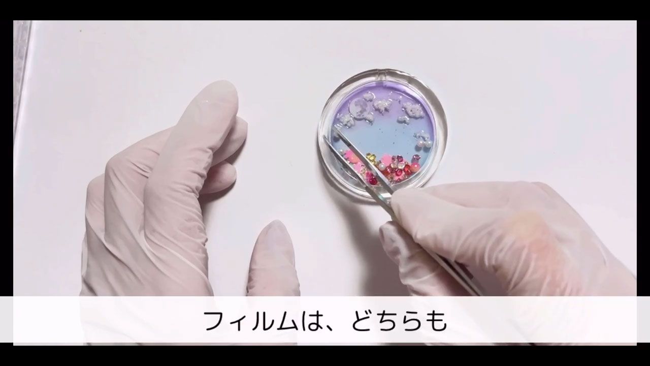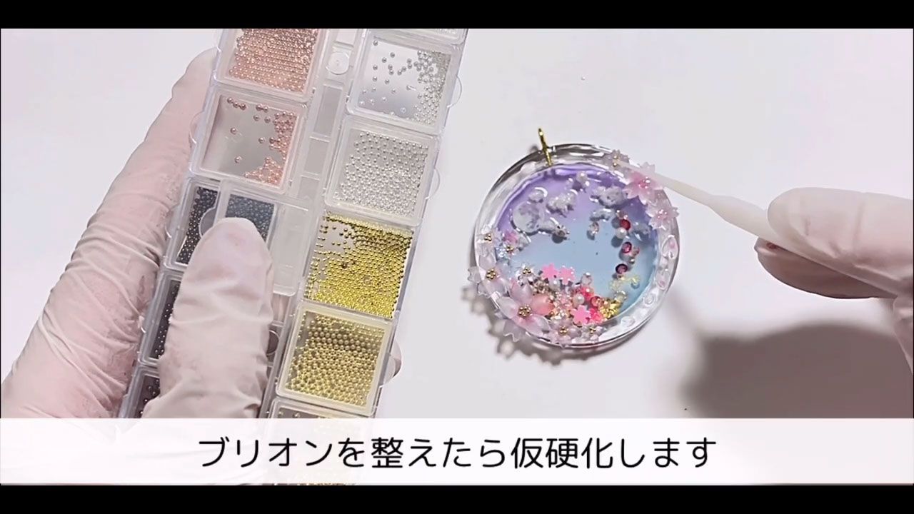 桜の中心にパールやブリオンを乗せて1分仮硬化します。