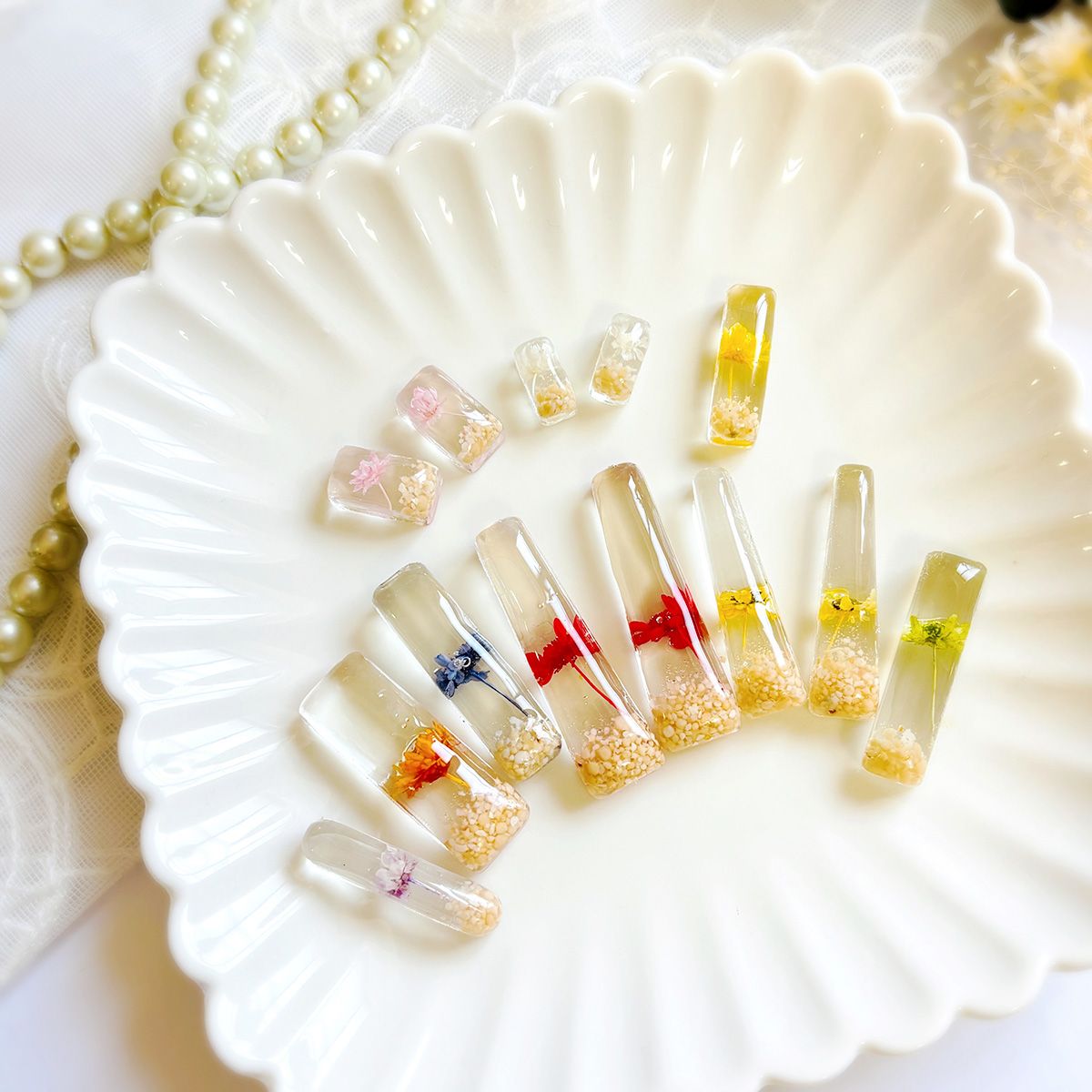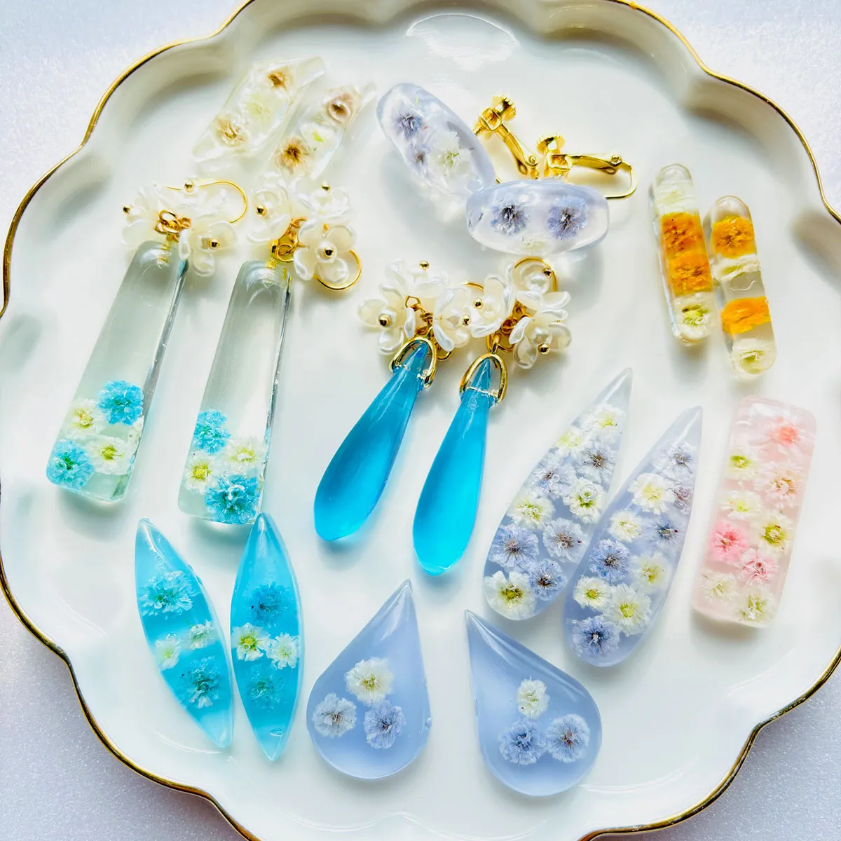 クリアカラーや淡いブルー、ピンク、イエローなどのレジンに、小花やラメを閉じ込めれば、透明感たっぷりの上品な仕上がりに。ぷっくりとした丸みのあるフォルムから、縦長で揺れ感を楽しめる形までそろっているので、可憐なテイストから大人っぽいデザインまで幅広く対応できます。