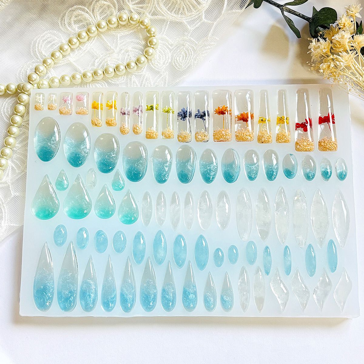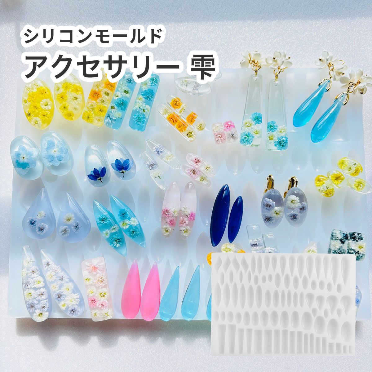 雫や長方形、オーバルなど幅広いアクセサリーパーツが作れる、大容量タイプのシリコンモールドです♪