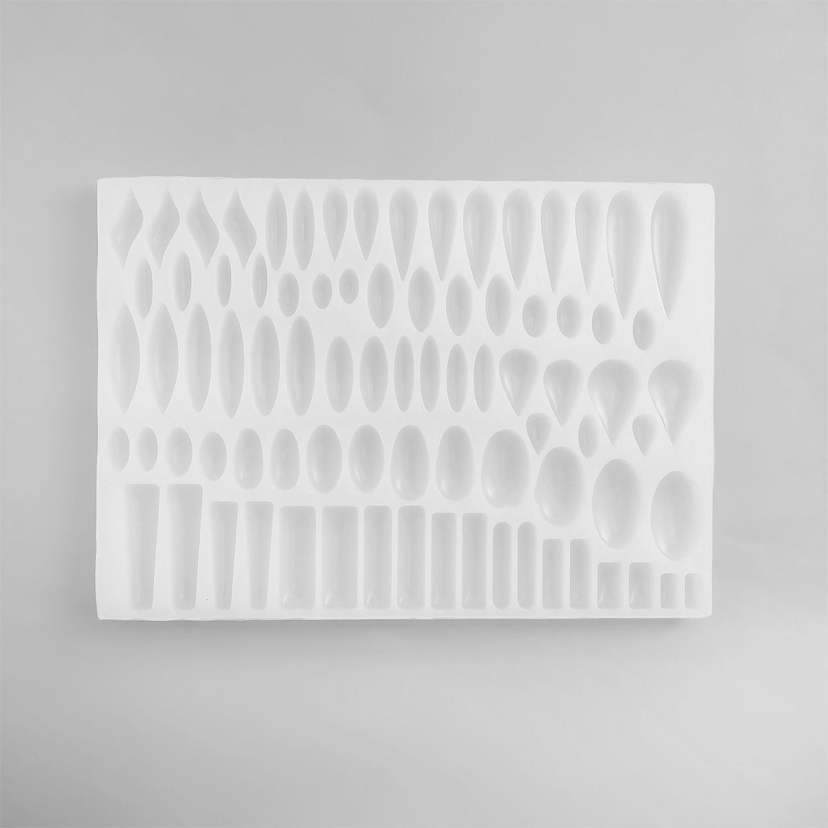 やわらかな白色のモールドに、細長いしずく型、丸みのあるオーバル型、すっきりした長方形型など、さまざまな形とサイズをたっぷり収録。ひとつでデザインの幅がぐっと広がり、ピアスやイヤリング、チャーム、ペンダントトップなどのアクセサリーパーツ作りに活躍します。このモールドひとつで、基本的な形のアクセサリーがひと通り作れるのも魅力です。