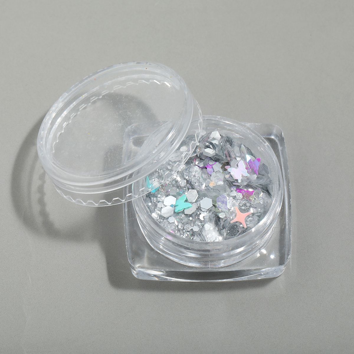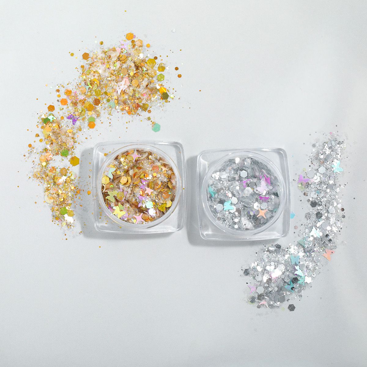 大小さまざまなサイズのラメや、蝶・星・六角形などのホログラムがブレンドされており、角度によって複雑でリッチな煌めきを放ちます。