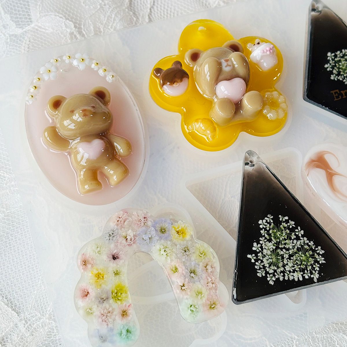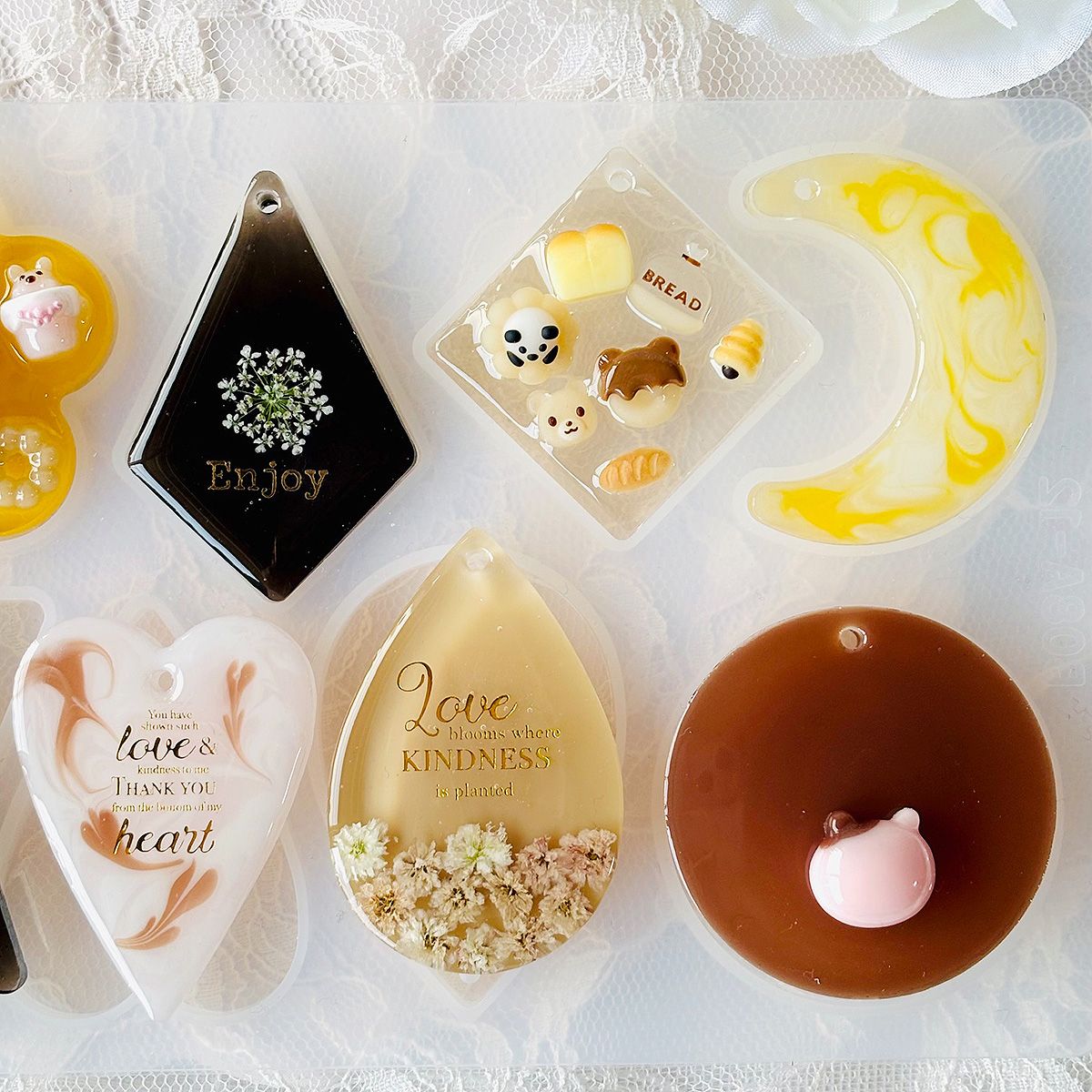各形状ともつるんとしたフラットな仕上がりになるため、文字シールやラメ、ドライフラワーなどを封入しやすく、「お名前キーホルダー」や「ネームタグ」制作にも非常に使いやすいデザインです。