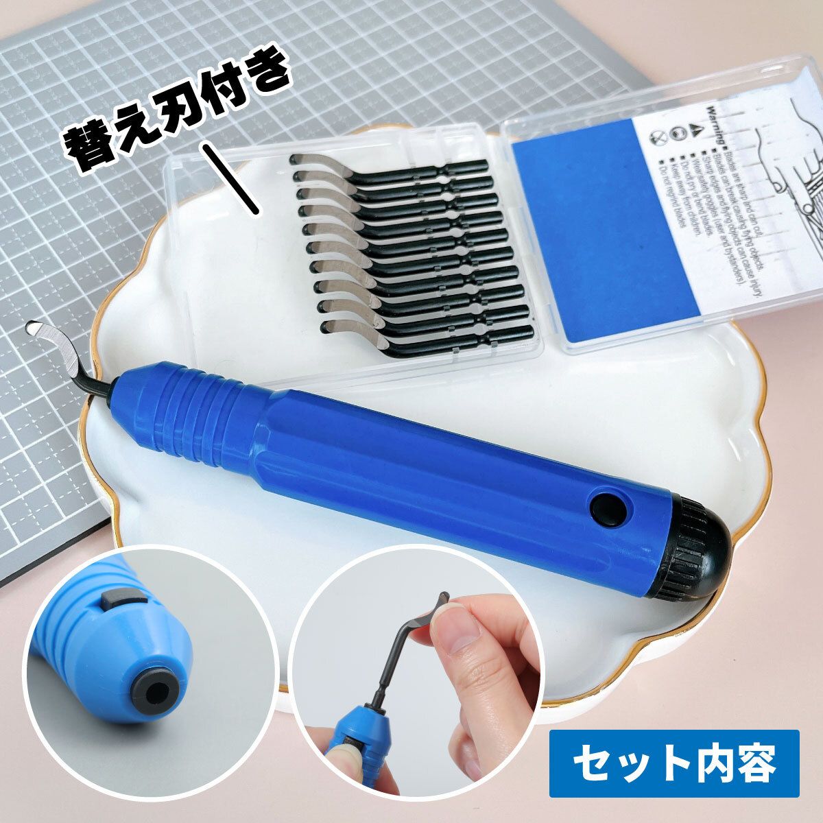 替刃10本付きで長く使え、ボタンを押すだけで簡単に交換可能。電源不要の手動タイプなので、作業机ですぐに使用できます。