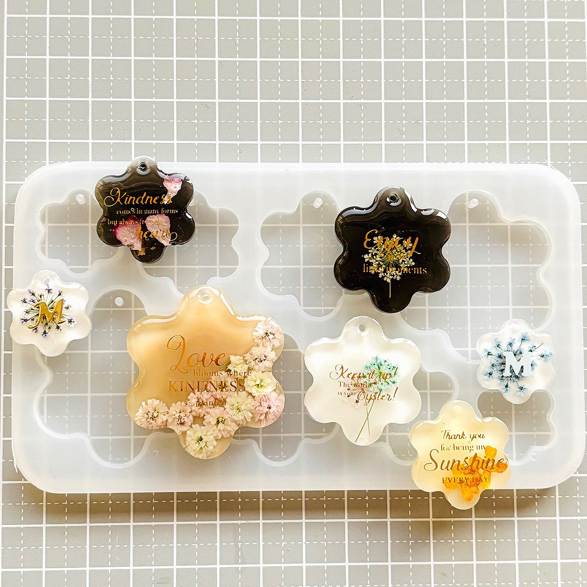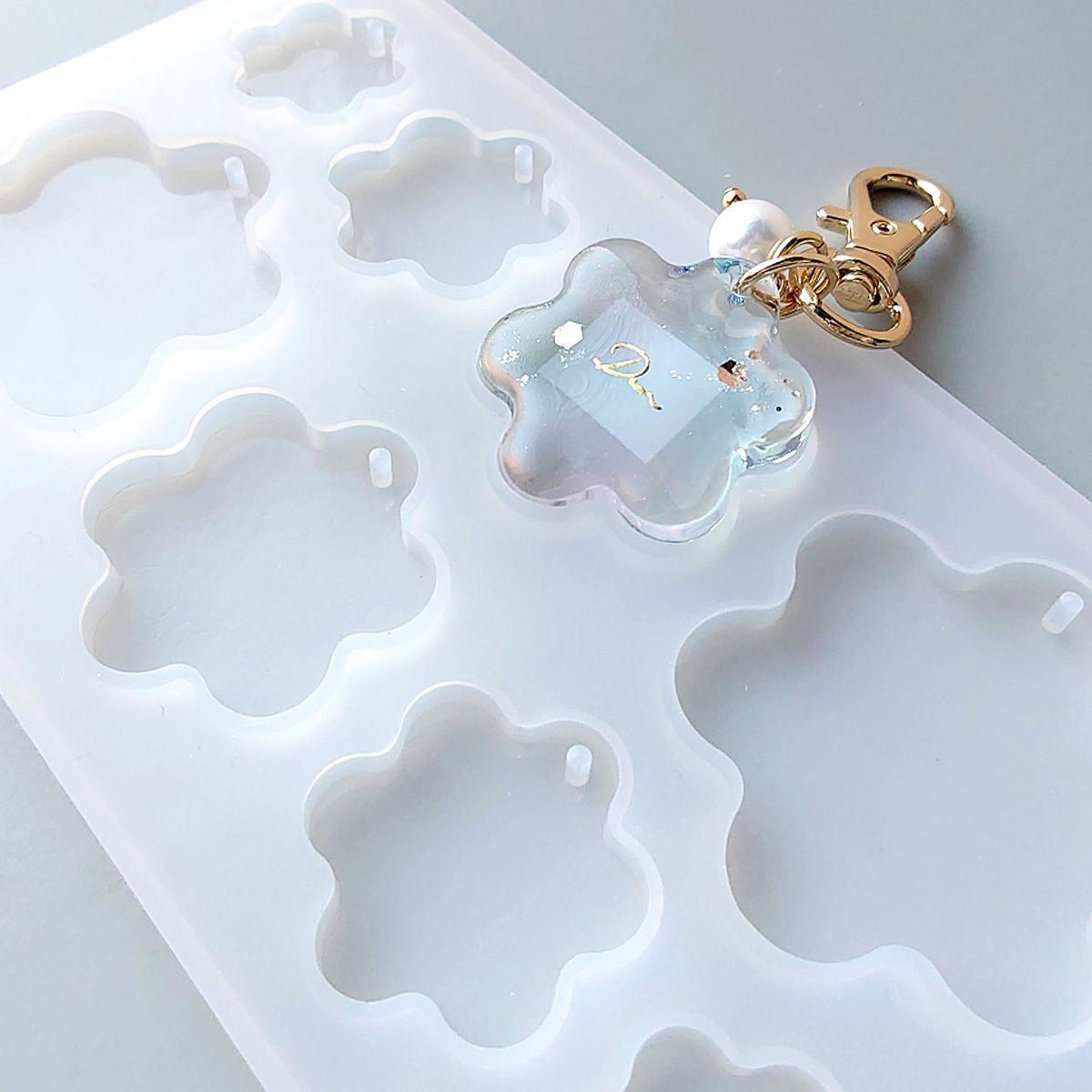 お花のようなやわらかいフォルムのチャームやキーホルダーパーツが作れる、穴あきタイプのシリコンモールドです♪