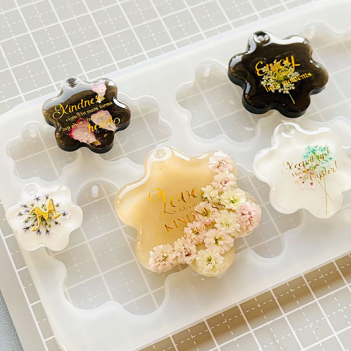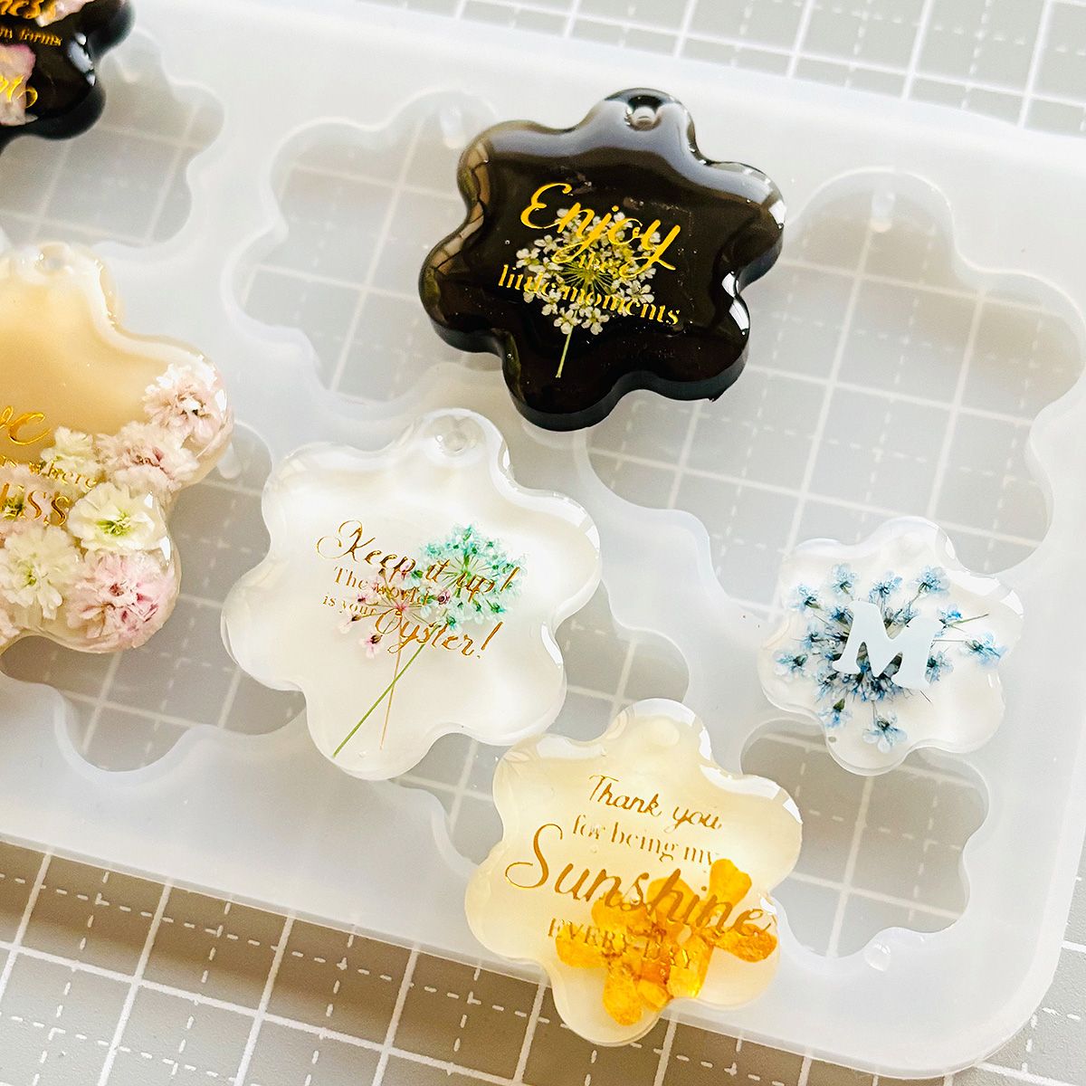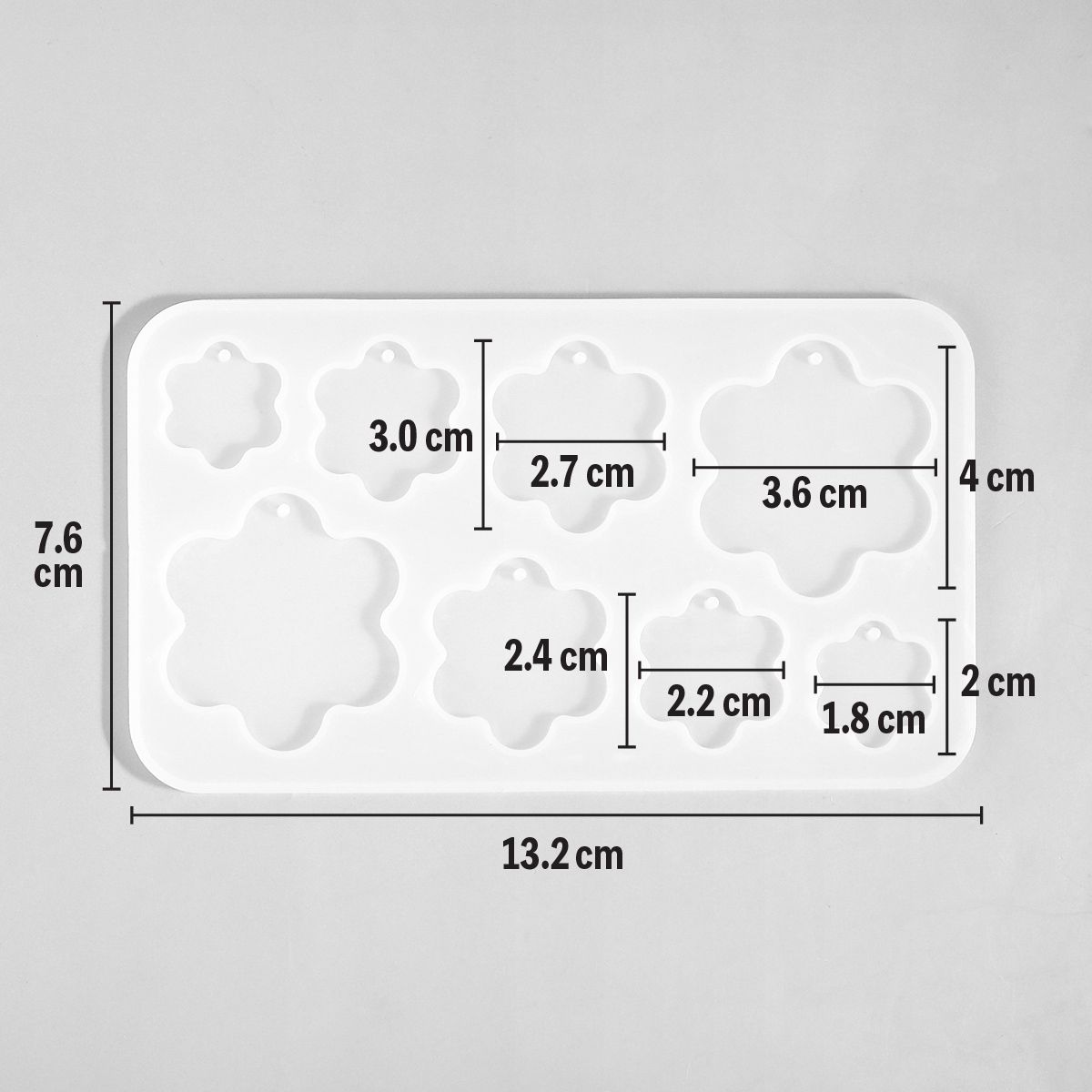 丸みのある花型がかわいらしく、つやっとした透明感のあるレジン作品づくりにぴったり。型の上部に穴あき仕様があるので、仕上がったあとにそのまま金具を通しやすく、キーホルダーやバッグチャーム、アクセサリーパーツ作りにも取り入れやすいデザインです。