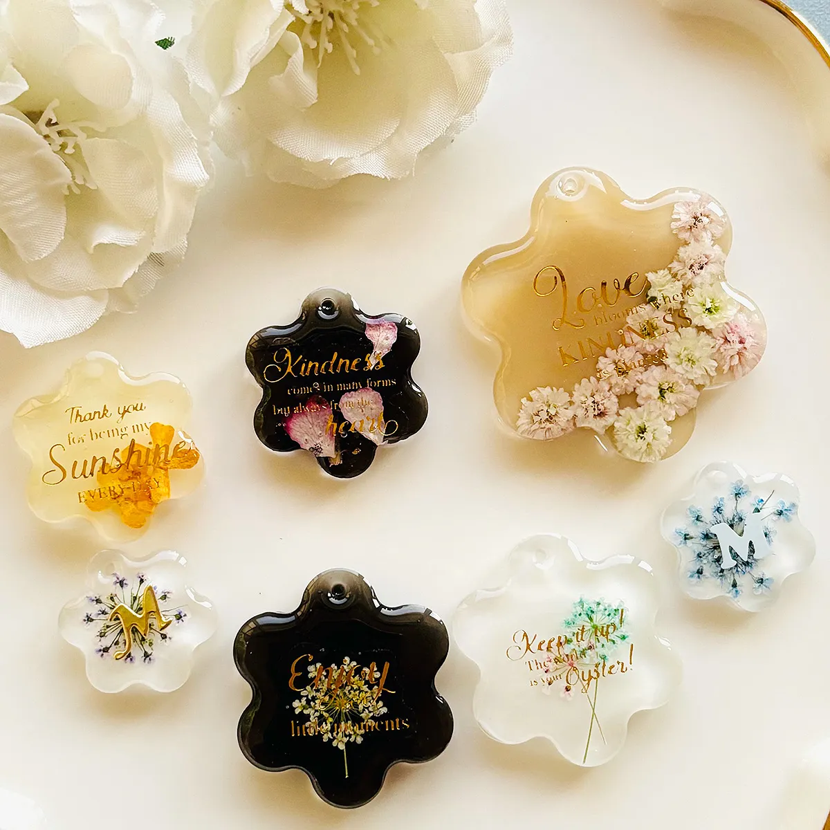 サイズは約1.8cm〜3.6cm幅の4サイズ展開で、小さめのワンポイントから存在感のあるモチーフまで幅広く楽しめます。封入素材やドライフラワー、ラメ、イニシャルパーツなどを合わせれば、やさしい雰囲気からシックな印象までアレンジしやすいのも魅力です。
