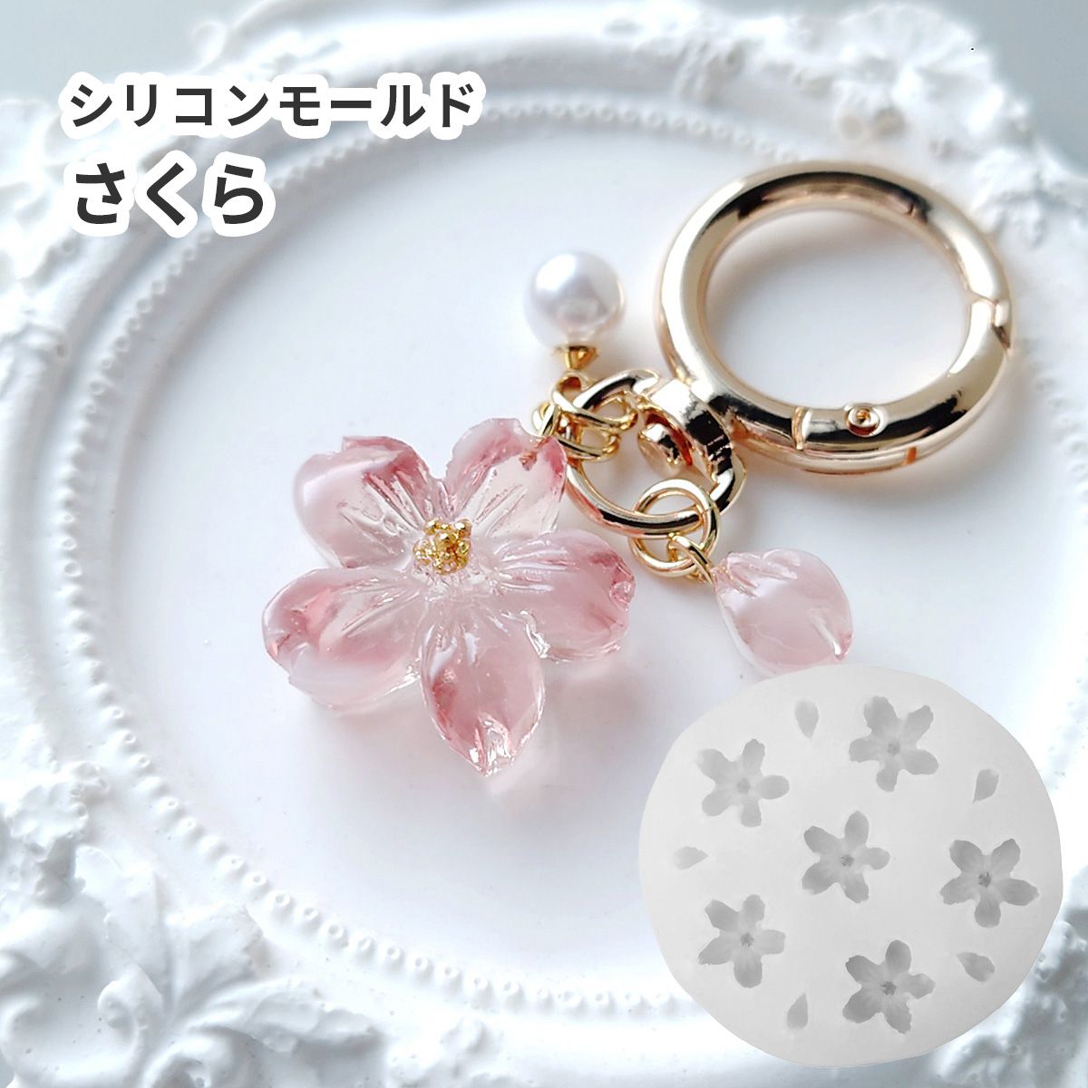 サクラのシリコンモールドです。ピンクのグラデーションのレジンを流し込んだり、ニュアンスカラーを使うのがおすすめ◎
