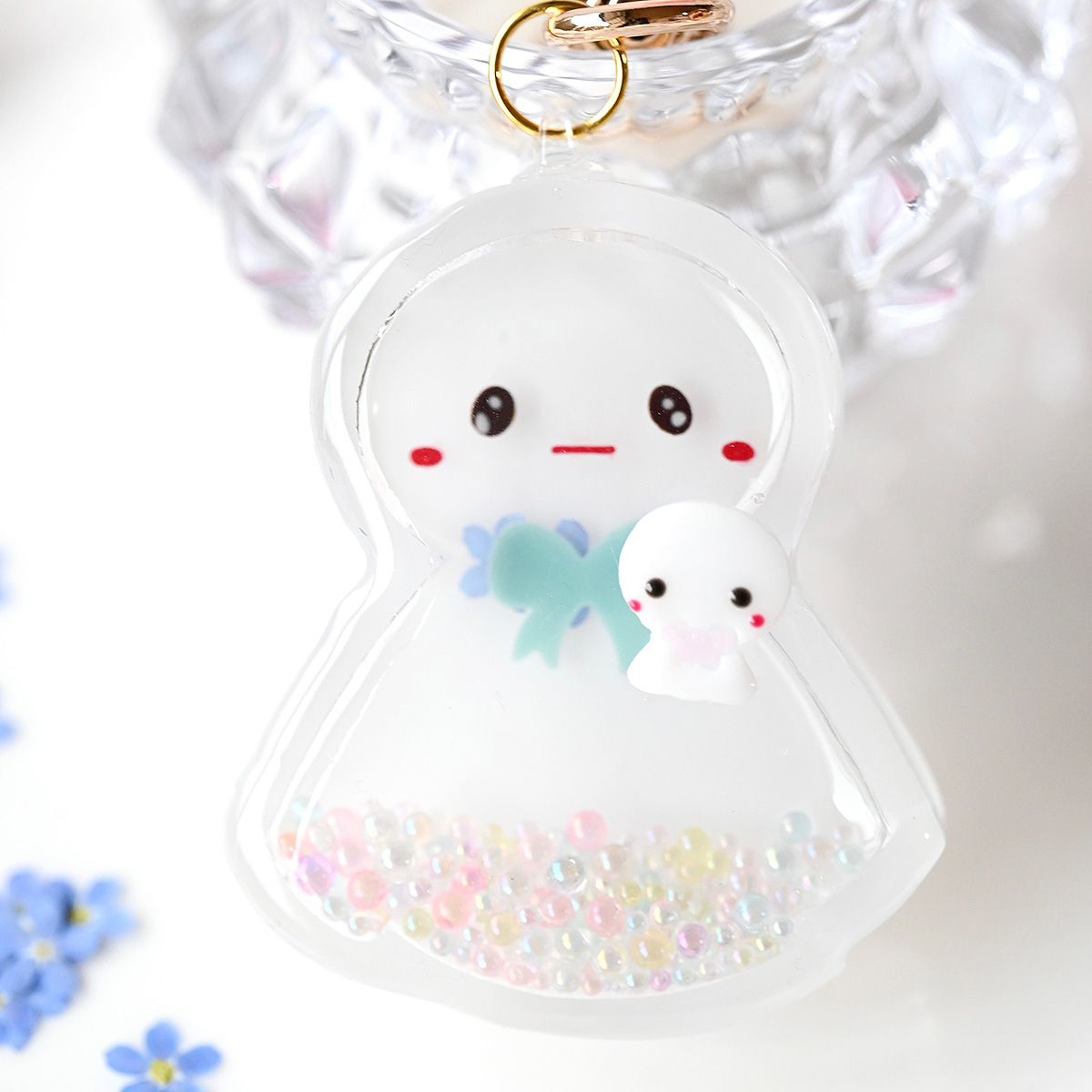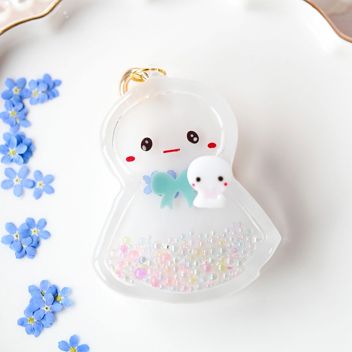 ・シェイカーの中に小さなビーズを封入し、旅行やイベントの前に作る晴れ祈願のお守りキーホルダーにする